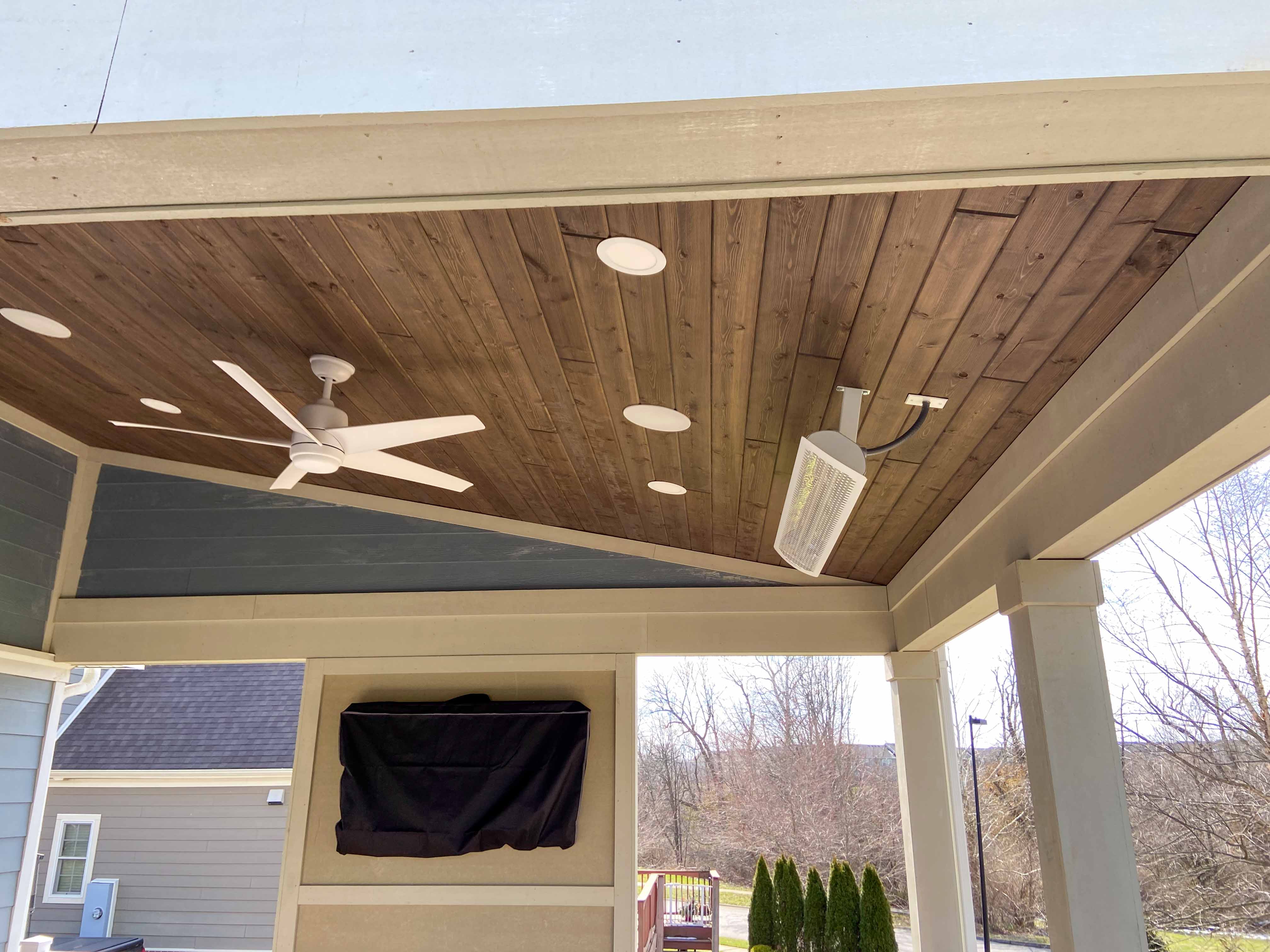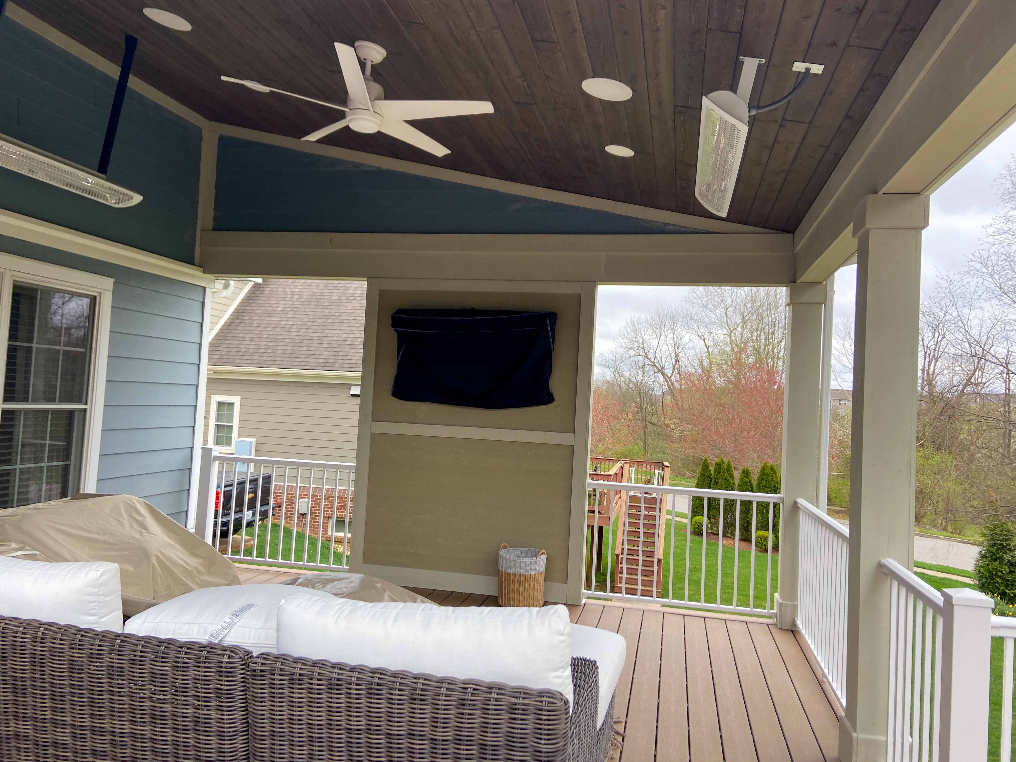 Built an elevated composite deck with white vinyl railing and a fully covered roof structure. The finished ceiling features stained tongue-and-groove planks, recessed lighting, ceiling fan, and dual infrared heaters for all-season use.